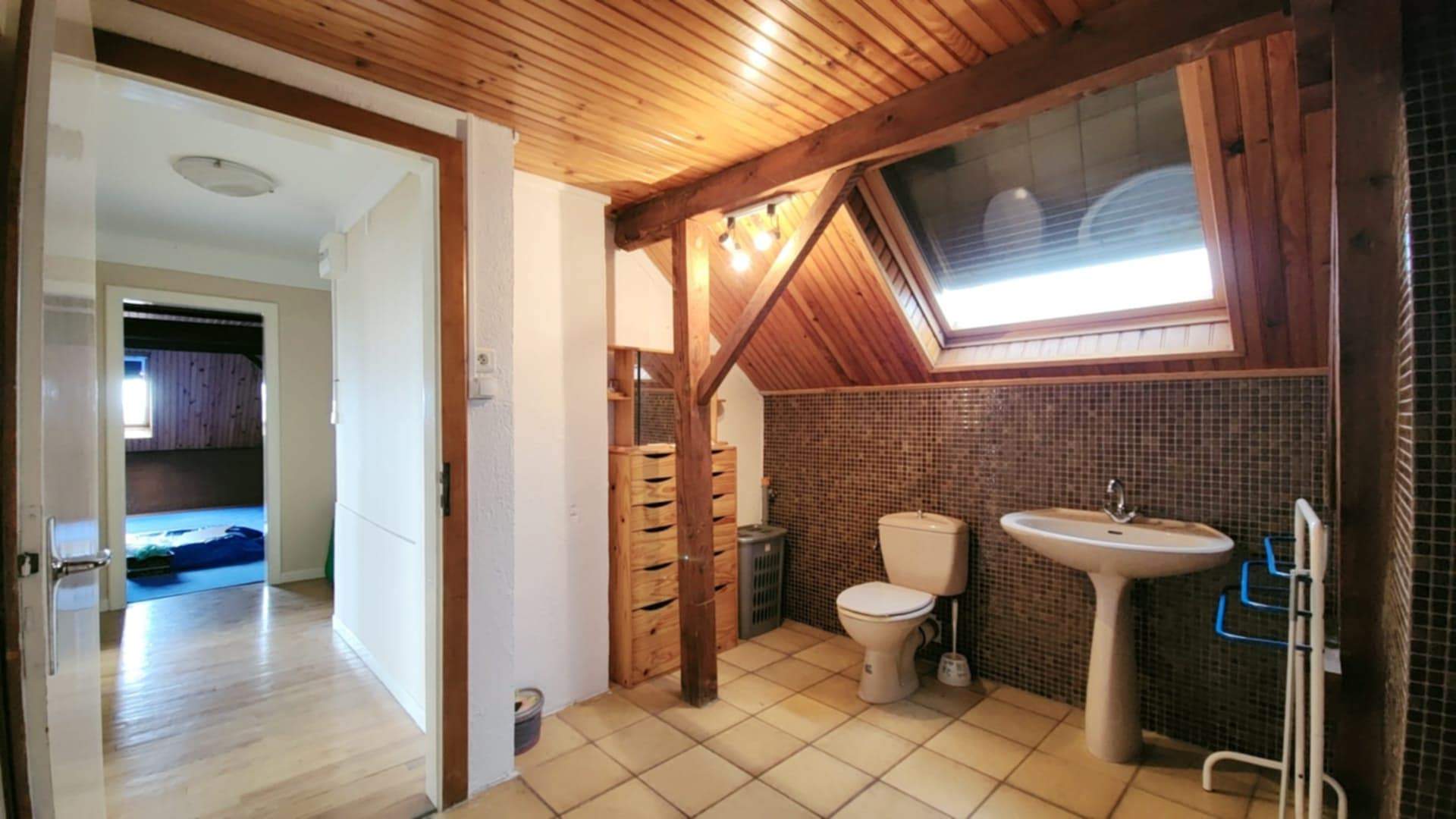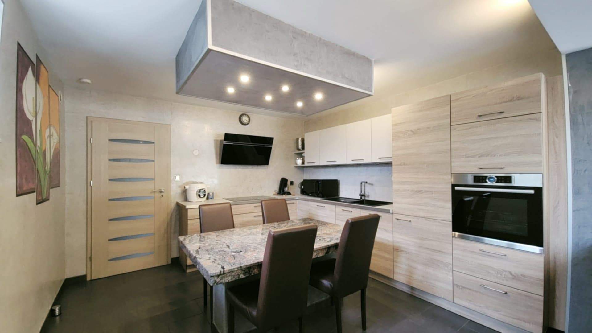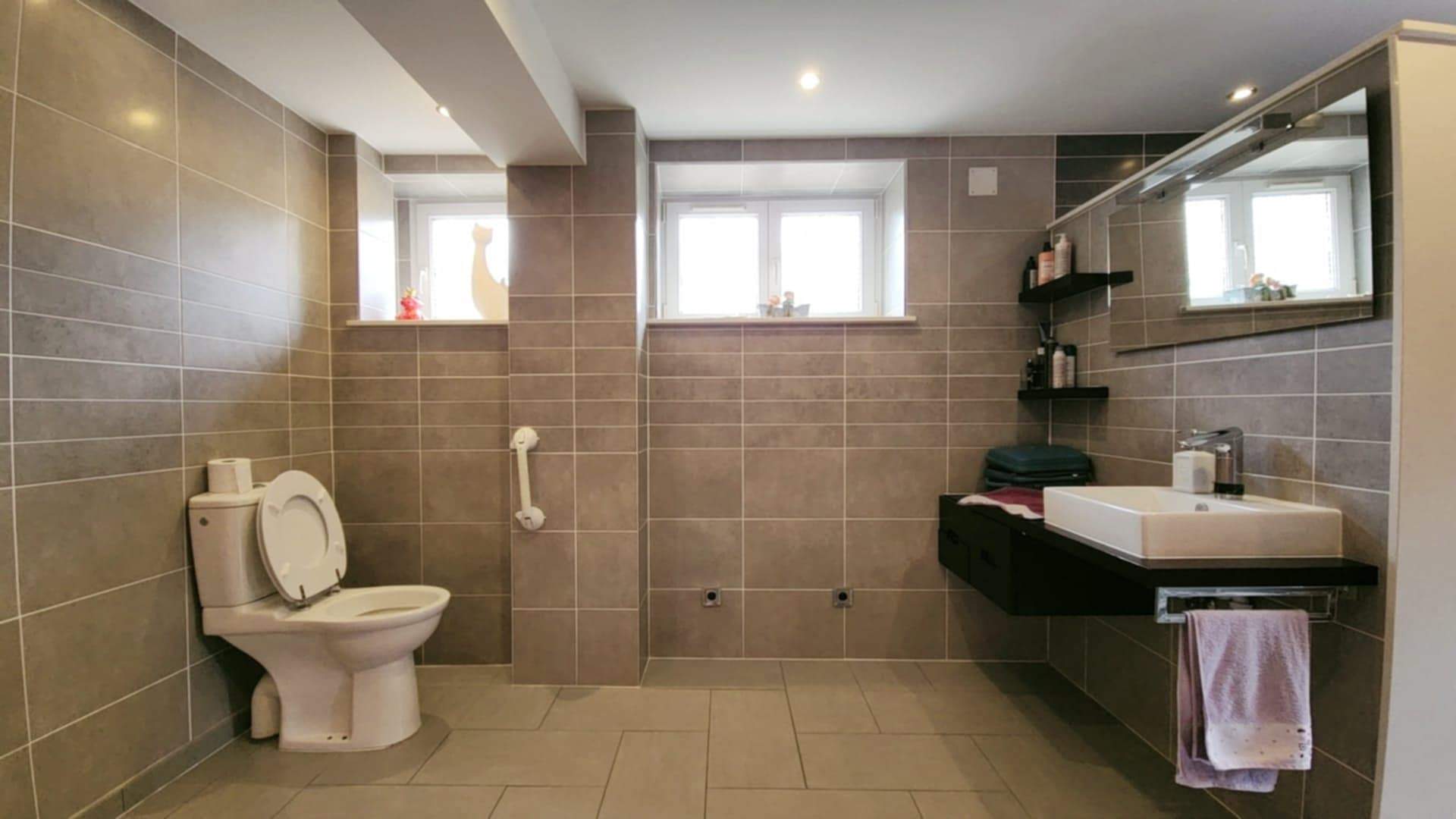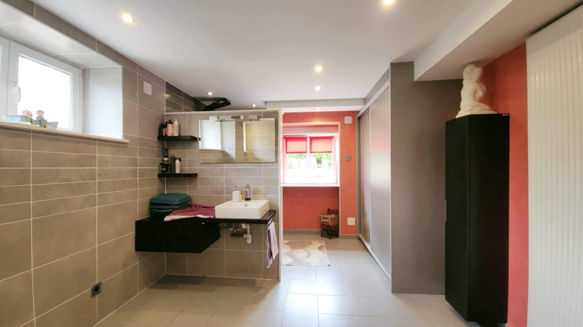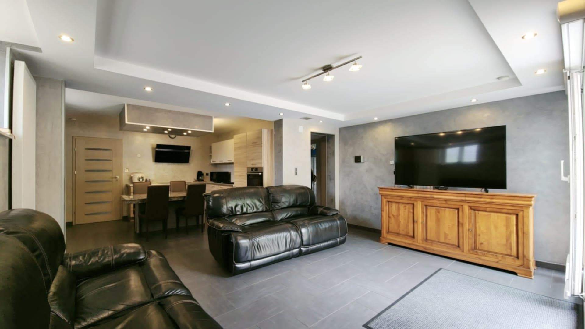 Au rez-de-chaussée : un appartement fonctionnel et lumineux (101m²) Un hall accueillant, une vaste salle de douche moderne avec toilette, lavabo et fenêtre, un salon confortable baigné de lumière grâce à ses baies vitrées La cuisine équipée, ouverte sur la salle à manger, est idéale pour partager des repas en famille ou entre amis. Une grande chambre de 30 m² avec accès direct sur l’extérieur offre un véritable havre de paix. L’appartement dispose également d’une buanderie, d’un débarras spacieux et d’un accès direct à l’escalier menant à l’étage.